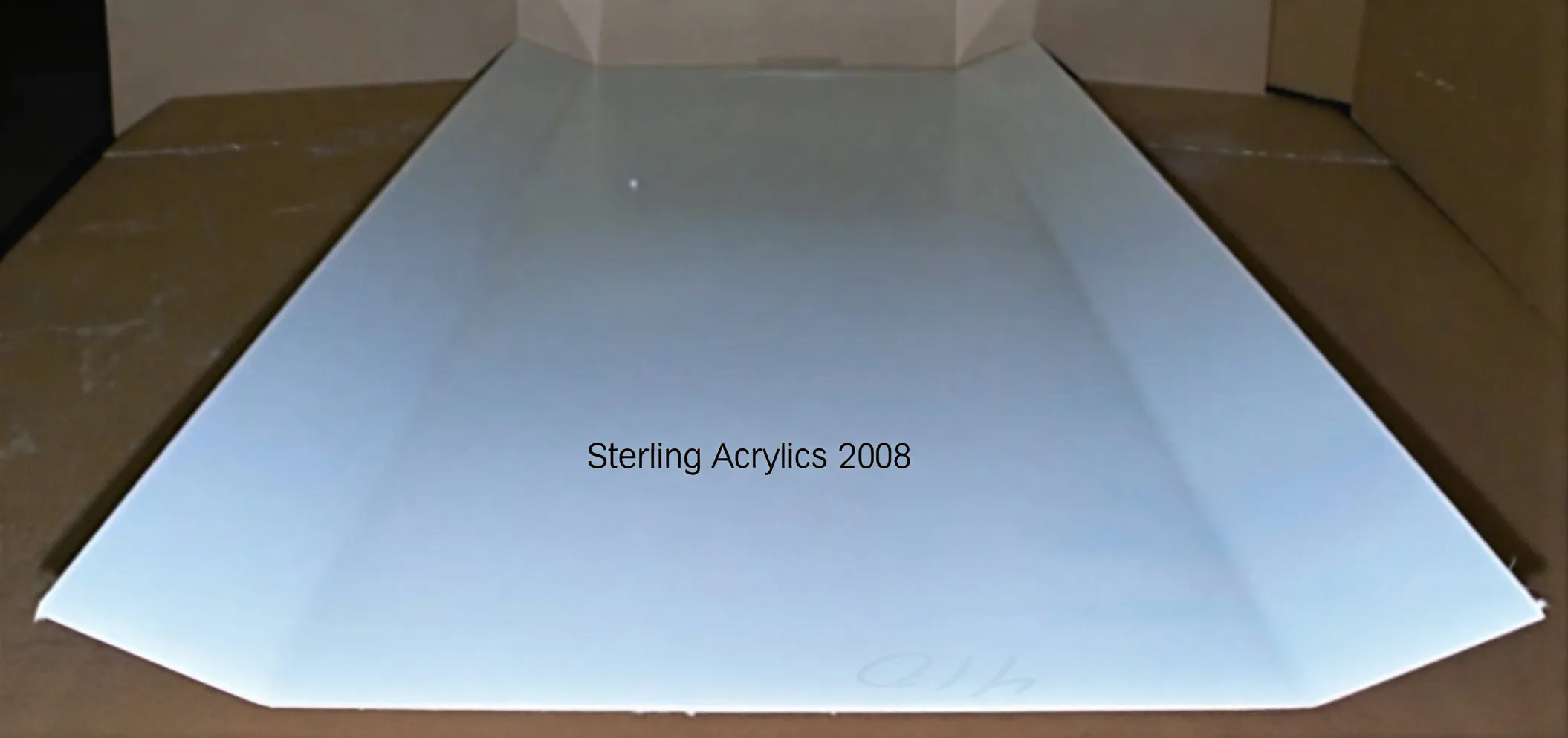 The masking of an indoor acrylic is designed by the manufacturer to block the user’s view of internal components of the beds because the tanning lamps do not cover all the surface area.  Please do not confuse masking with the protective film we ship our replacement acrylics with.  When you receive your replacement shield, please inspect the plastic film for scratches and damage and DO NOT peel off this film if damage is present.  Please refer to our shipping and returns policy here.  When ordering tan acrylics, please note how many facial lamps your bed has and what the masking pattern is.  Remember, masking is permanent and the protective shipping film should be removed once the visual inspection is complete.  Pictured here is a two bend acrylic with protective shipping film still attached.  Please inspect for damage and scratches before removing.  Be careful not to remove any masking, if present.